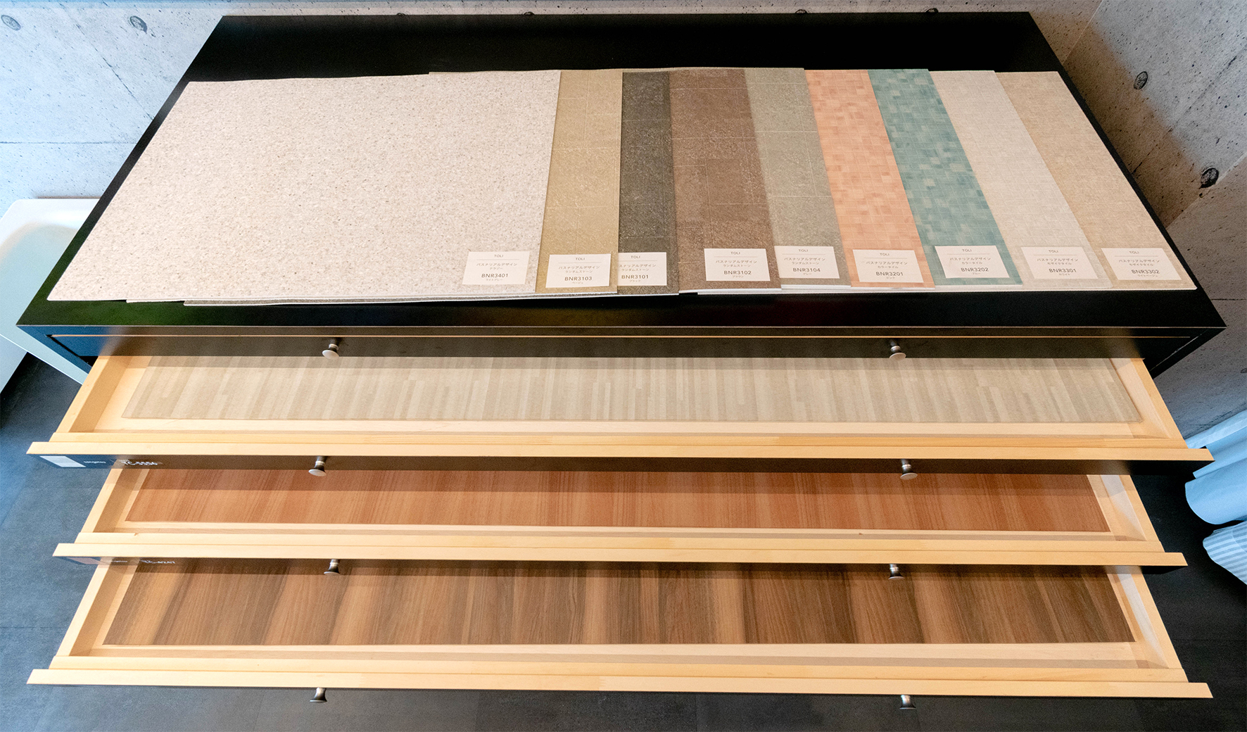 弊社で取り扱っているシートの一覧を展示しています。 パネル・シート・塗装の質感や手触りを、実際にお手に取ってご確認いただけます。