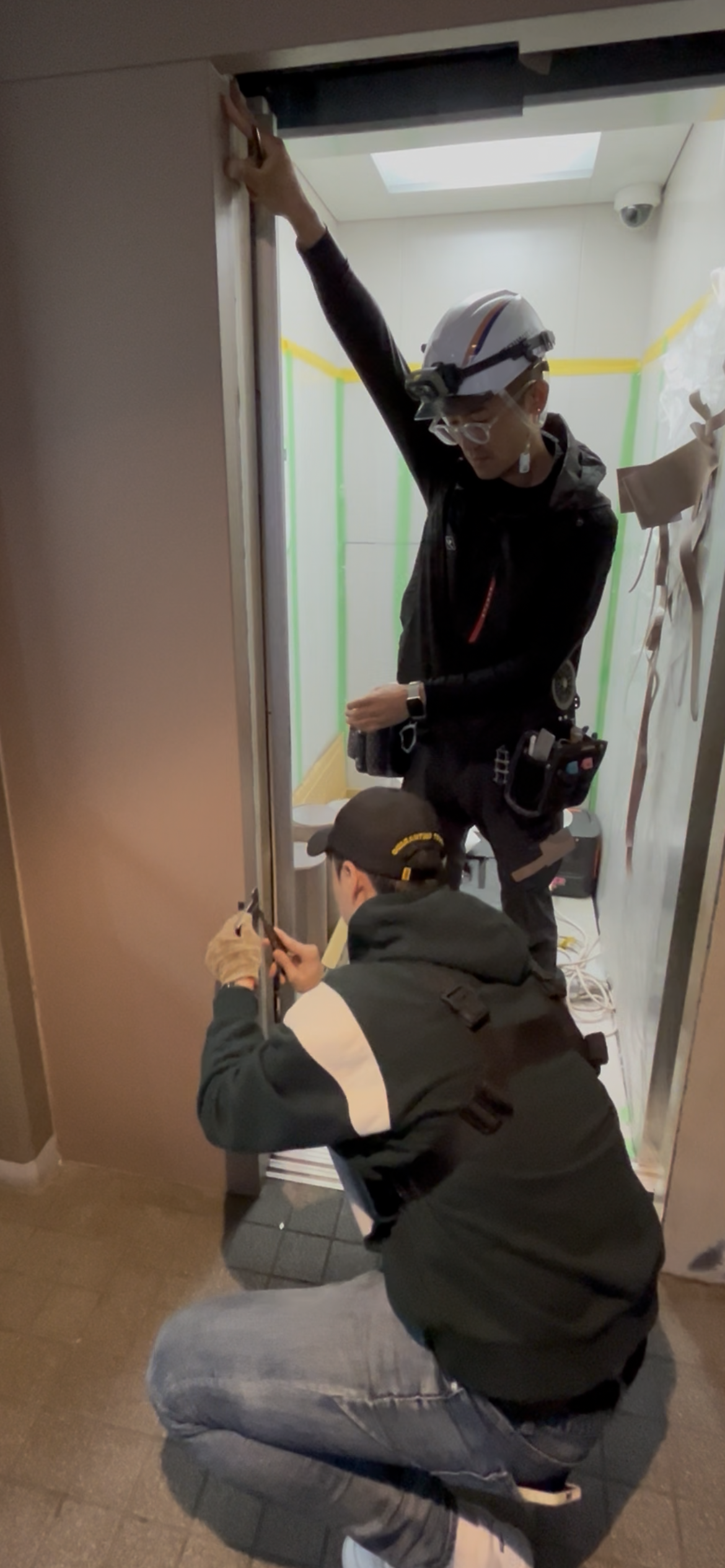 2件目はトリウェルさんのエレベーターのシート貼り現場にお邪魔させていただきました。