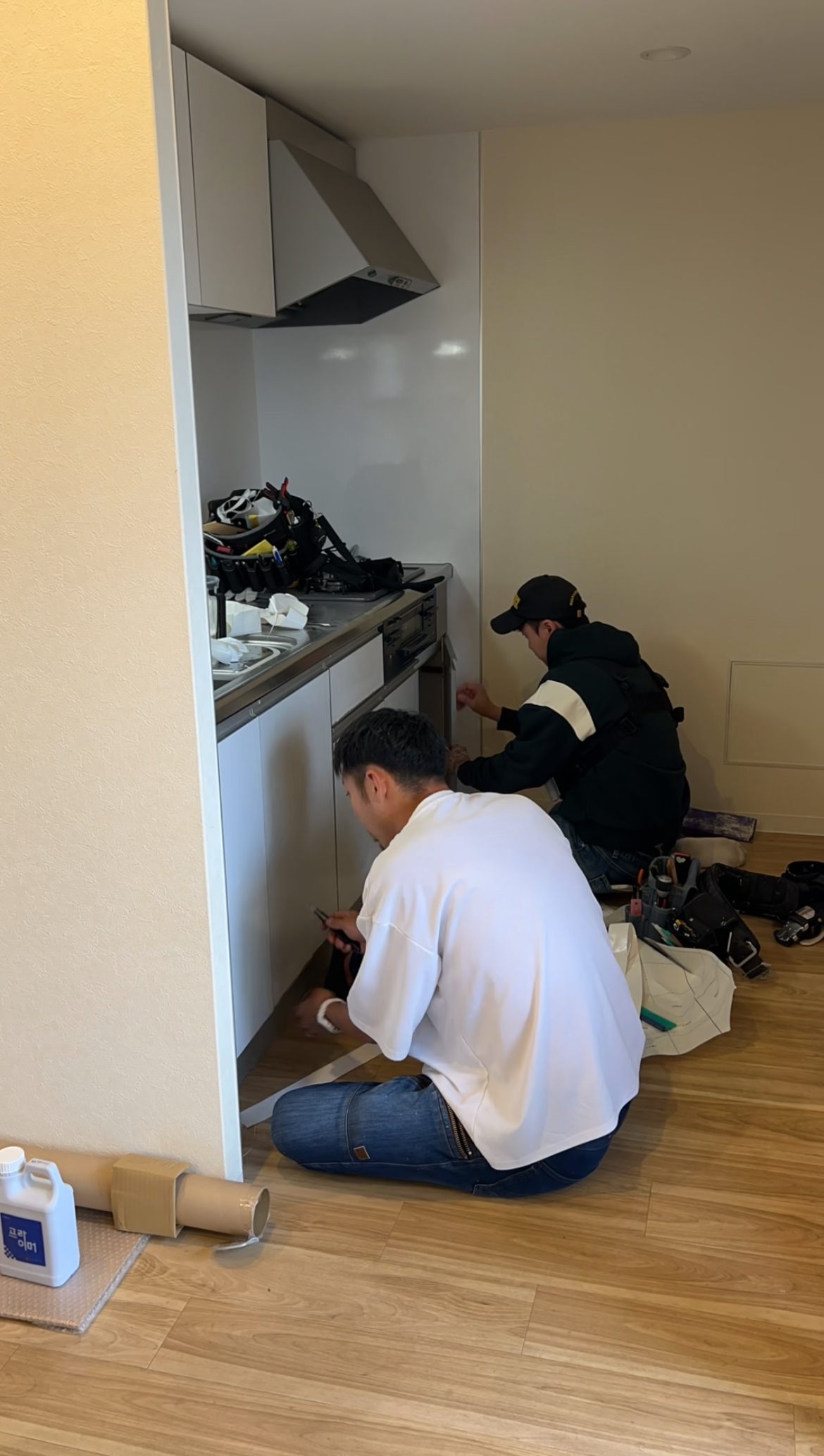 浴室シート貼りが終わった後、宮﨑くんとジホさんが一緒にキッチンの扉にダイノックシートを貼りました。