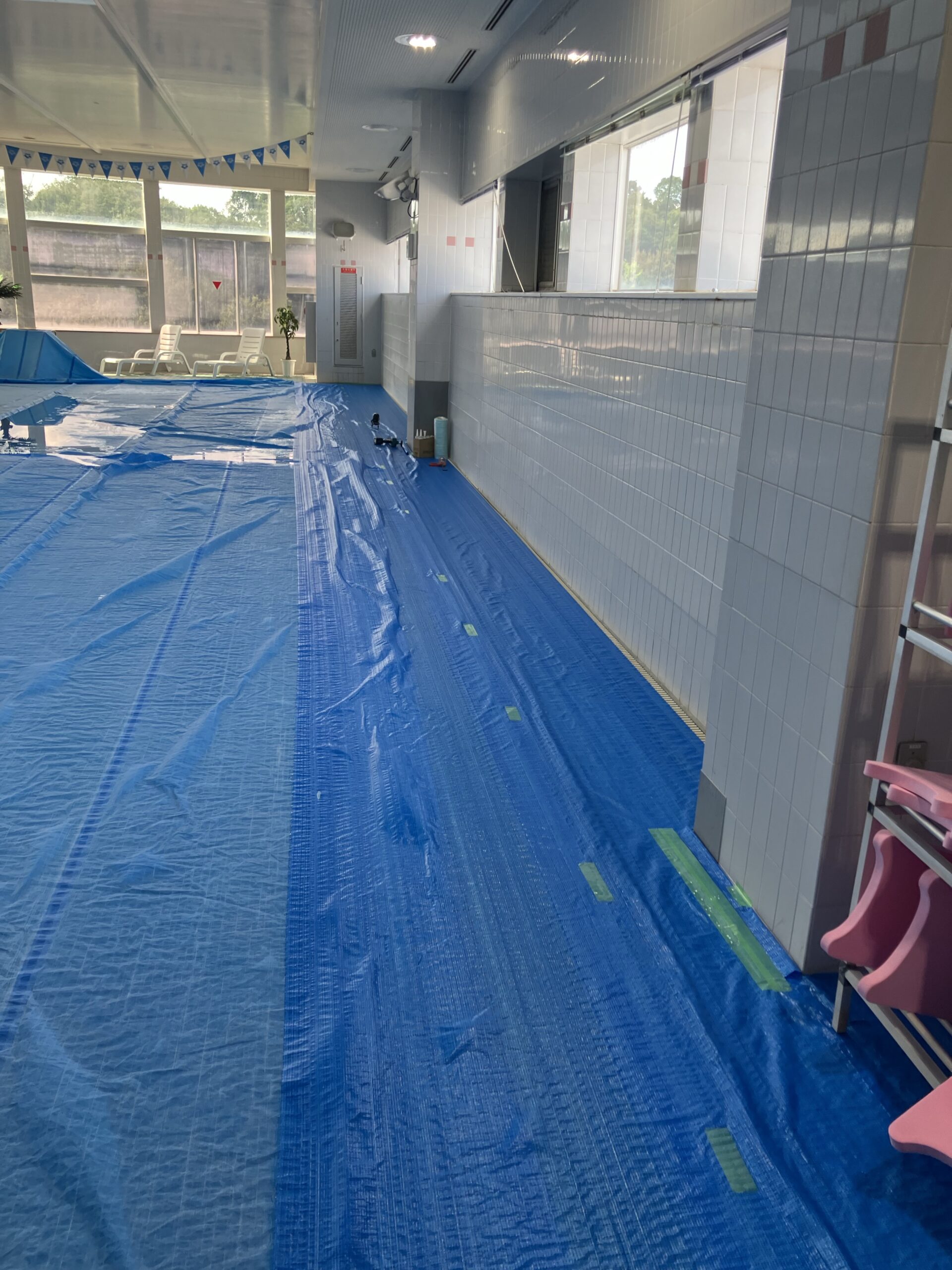 温水プールのプールサイドのパネルがヒビが入っていたのでパネルを貼って利用者がケガをしないようにパネルを貼っていきます。