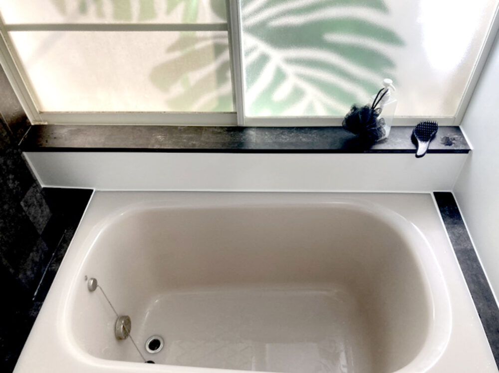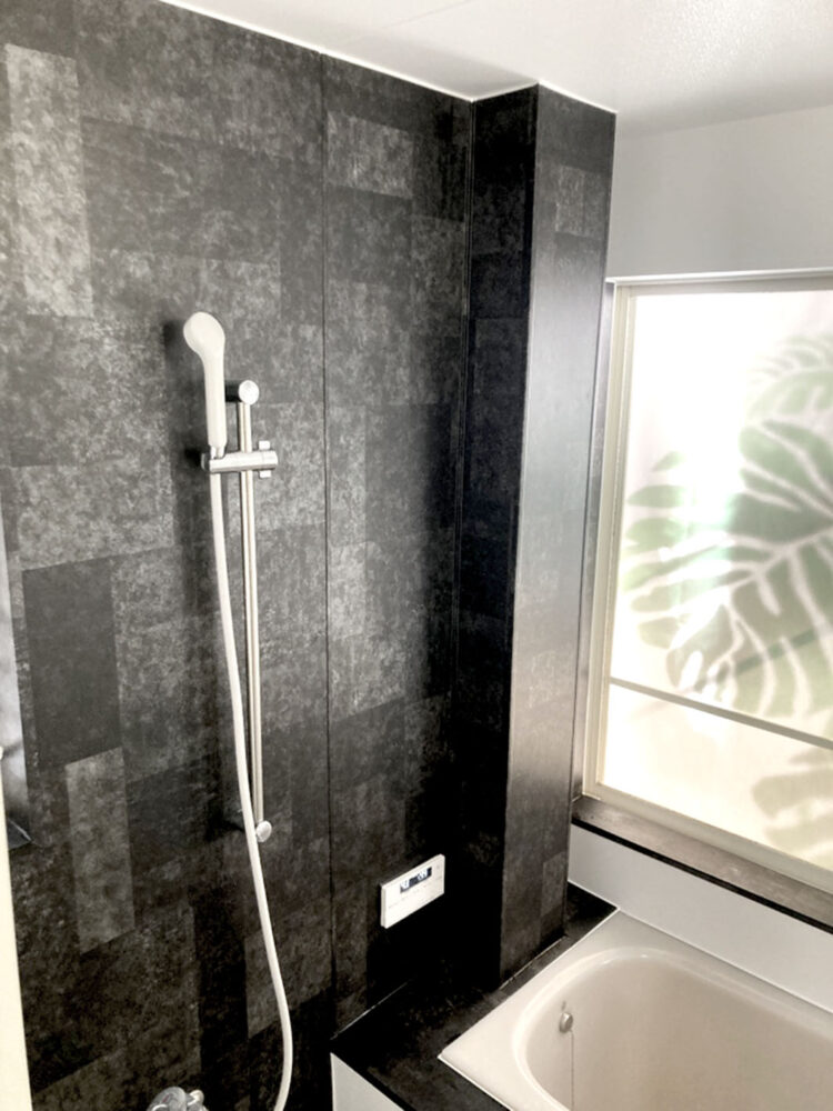 水栓面側、窓側天板、浴槽周り天板に黒色の大理石調のシート、その他壁と天井には白を使用しました。