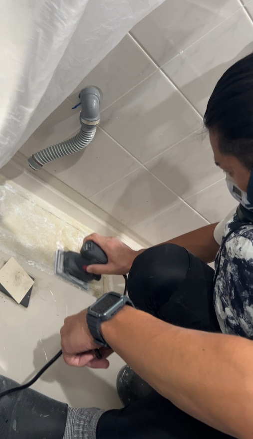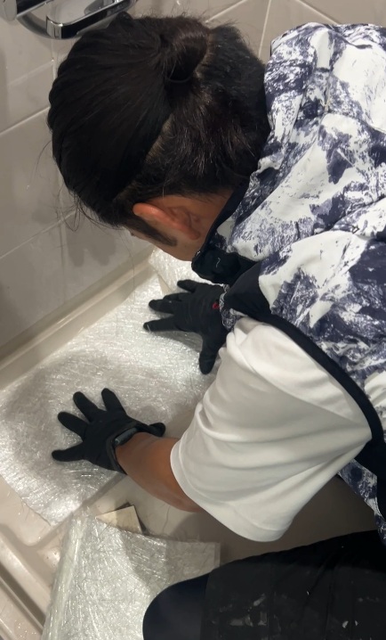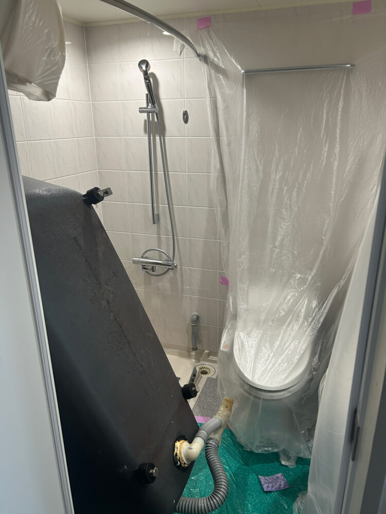 まず浴室内を養生し浴槽を移動させます。