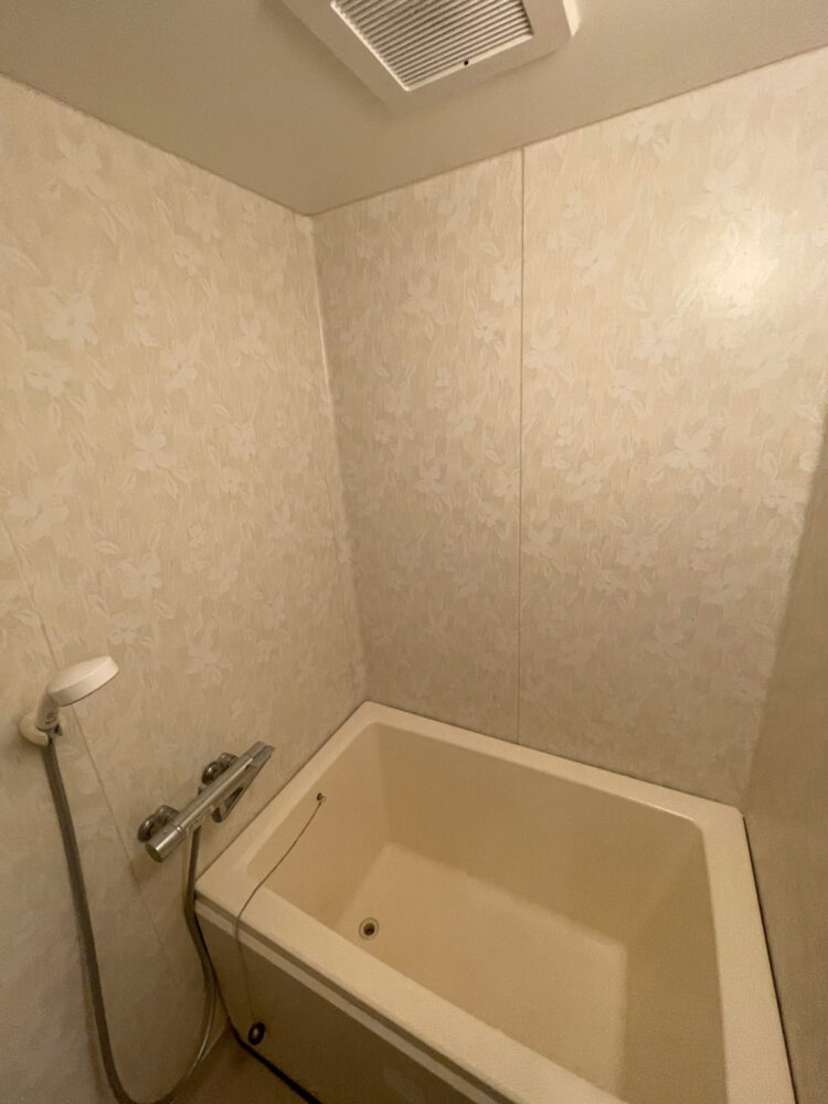 壁面の柄が少し古い印象を与え、全体的な変色も見られます。