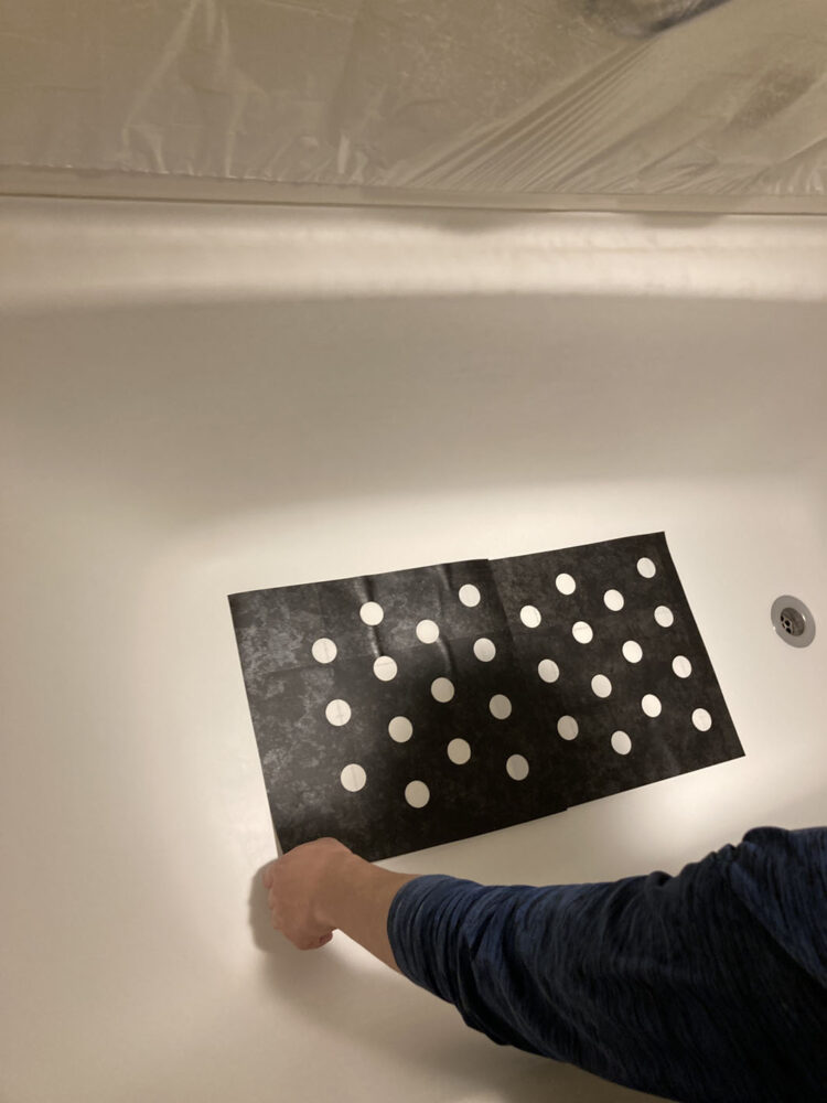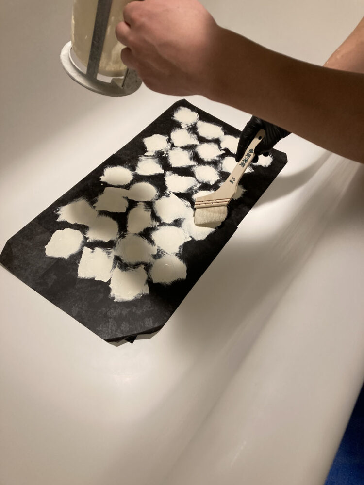 滑り止め加工用の台紙を浴槽底にセットし、骨材入り塗料を塗り付けます。