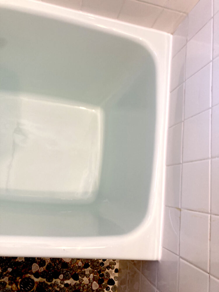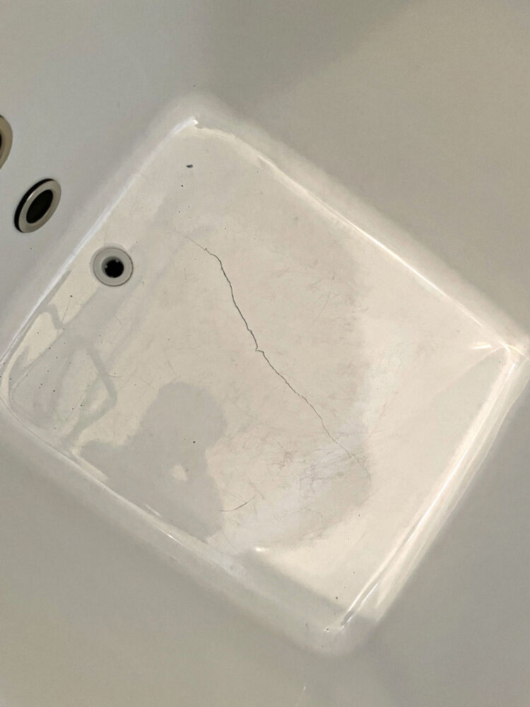 ライトブルーの浴槽ですが経年劣化により底面に亀裂が入っています、、、