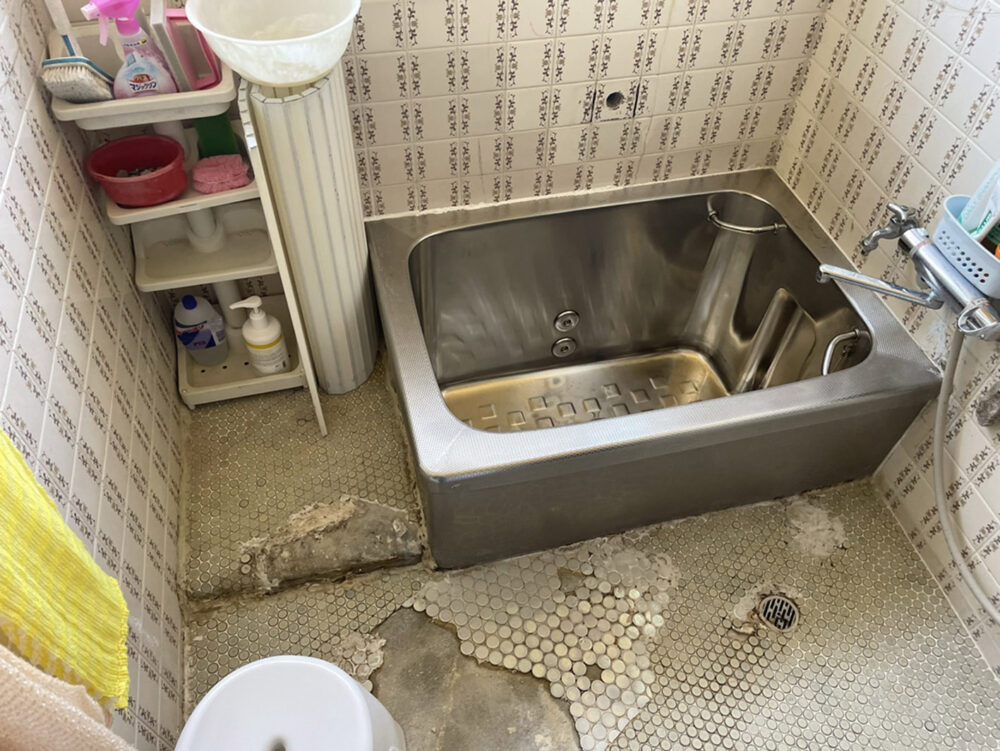 施工前はこのように床のタイルが剥がれており天井、壁なども全体的に暗い印象の在来浴室でした。